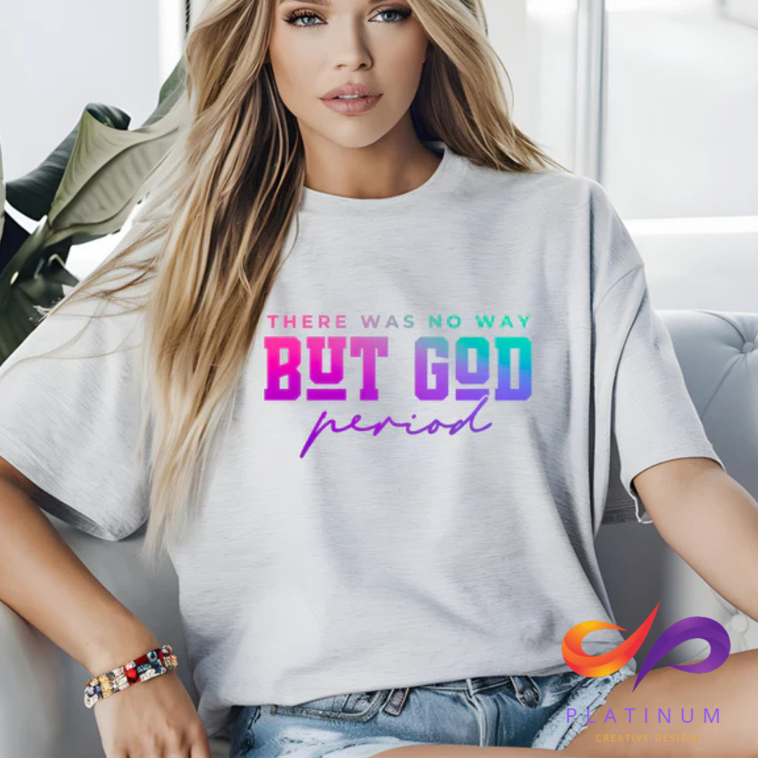 Introducing the THERE WAS NO WAY BUT GOD t-shirt, featuring an ombre design in pink, teal, and purple. The bold and underlined lettering adds a powerful touch, while the cursive "period" adds a subtle yet impactful message. Available in multiple styles including unisex, adult, and various sleeves. Trust in God and show it off with this statement piece.